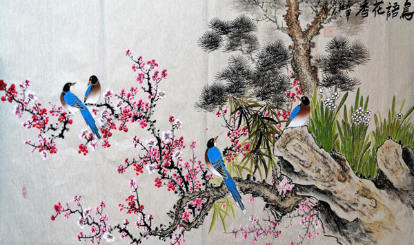 其自幼随母习画,博文精艺,三伏勤勉,坚持不渝。其绘画技艺,集花鸟、人物、山水神融一体,妙笔生辉,惟妙惟肖,别具一格。其书法技艺,笔走龙蛇,颜筋柳骨,泼墨淋漓。